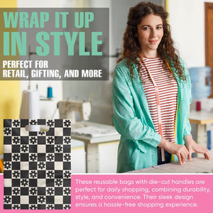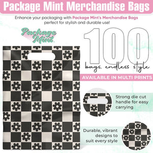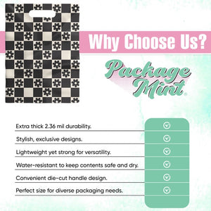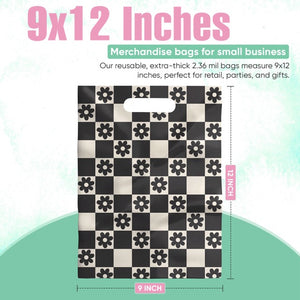 Our 9x12 inch merchandise bags feature an exclusive daisy checkerboard pattern, combining extra-thick 2.36 mil LDPE material for superior strength and eye-catching aesthetics.