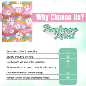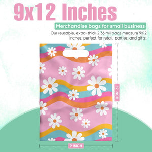 Our 9x12 inch merchandise bags feature an exclusive groovy daisy pattern, combining extra-thick 2.36 mil LDPE material for superior strength and eye-catching aesthetics.