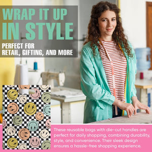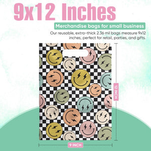 Our 9x12 inch merchandise bags feature an exclusive smile checkerboard pattern, combining extra-thick 2.36 mil LDPE material for superior strength and eye-catching aesthetics.