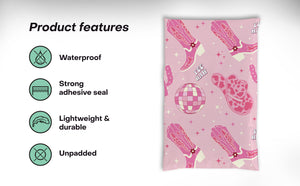 Our 100-pack of 6” x 9” poly mailers features a cool pink and white disco cowgirl print that isthe best way to give a great first impression to your business. These peel and seal cute shipping bags are tear-proof and waterproof. Our shipping bags for clothing are USPS, UPS, FedEx & DHL approved so you can ship with confidence!
