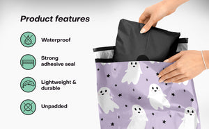 Our 100-pack of 10” x 13” poly mailers features a cute purple/black/white ghost print that is the best way to give a great first impression to your business. These peel and seal cute shipping bags are tear-proof and waterproof. Our shipping bags for clothing are USPS, UPS, FedEx & DHL approved so you can ship with confidence!