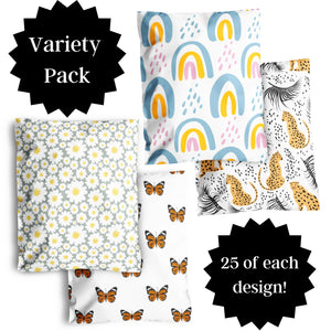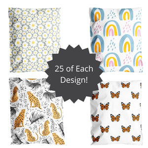 Our 100 pack of 10” x 13” poly mailers feature 25 of each of 4 of our most loved mailers- Cheetah Palm, Boho Rainbows, Daisies and Butterflies! These peel and seal cute shipping bags are tear-proof and waterproof. Our shipping bags for clothing are USPS, UPS, FedEx & DHL approved so you can ship with confidence!