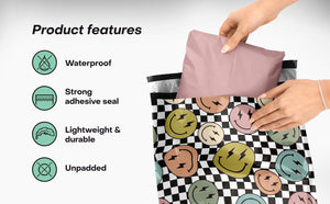 Our 100 pack of 10” x 13” poly mailers feature a smiling faces and checkerboard print that is the best way to give a great first impression to your business. These peel and seal cute shipping bags are tear-proof and waterproof. Our shipping bags for clothing are USPS, UPS, FedEx & DHL approved so you can ship with confidence!