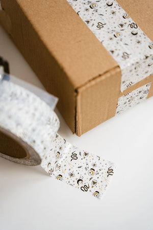 Our colorful packaging tape features a unique celestial boho print that is the best way to give a great first impression to your business. These tape rolls are perfect for sealing boxes, envelopes and more! Add flair to your packaging with our custom designer tape rolls!